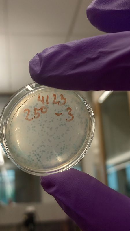 Plate with M13 bacteriophage. Each dot on the plate is a phage-forming unit (PFU).